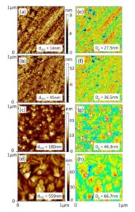 首先,使用KLA Instruments™ 的Filmetrics F50-UVX薄膜厚度测量仪测量了九种不同厚度的ITO薄膜。随后,使用KLA Instruments™的探针式轮廓仪 HRP®-260(台阶仪)测量晶圆翘曲和应力(见图 1)。在晶圆翘曲测量中,系统在每次扫描后自动旋转样品,生成三维(3D)翘曲图,并通过Stoney方程自动计算三维应力图(见图2)。接着,通过原子力显微镜(AFM)评估沉积薄膜的晶粒结构(见图3 和图4)。最后,使用KLA Instruments™的Nano Indenter® G200X纳米压痕仪进行纳米压痕测试以评估ITO薄膜的弹性模量。