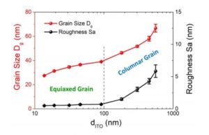 研究表明,随着ITO薄膜厚度的增加,应力类型从拉应力转变为压应力。AFM分析显示ITO薄膜表面呈三维生长模式,沉积过程中晶粒结构由等轴晶向柱状晶转变。