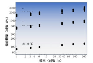 三个测试温度分别为室温、-28.5°C 和 -66.0°C ,在三个温度下分别从 1Hz 测到 200Hz 。随着温度降低,储存模量显著增加,1Hz 21.0°C 时为 80MPa,而 1Hz -66°C 时为 1600MPa。