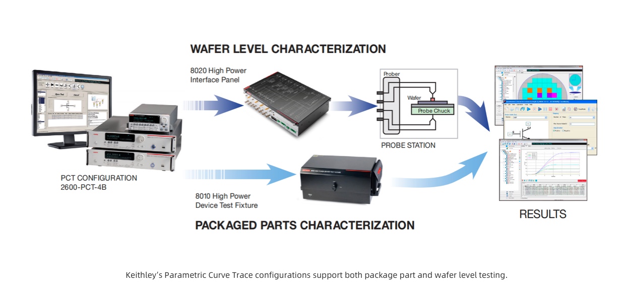 Keithley’s line of high power Parametric Curve Trace configurations supports the full spectrum of device types and test parameters. Keithley’s Parametric Curve Trace configurations include all necessary hardware for the characterization engineer to develop a complete test system quickly. Ordered separately, ACS Basic Edition software provides complete device characterization, including both real-time trace mode for quickly checking fundamental deivce parameters like breakdown voltage and full parametric mode for extracting precise device parameters.