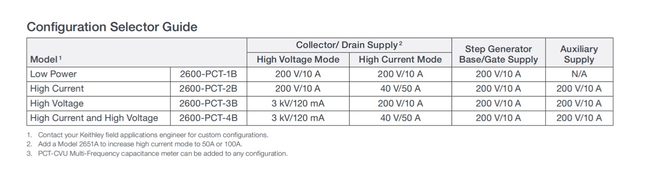 Testing device capacitance versus DC voltage is becoming more and more important. Keithley offers the PCT-CVU Multi-frequency capacitance-voltage meter. When combined with the optional 200 V or 3 kV bias tees, capacitance vs. voltage can be measured on two, three or four terminal devices.Capacitances from fF to 100 nF can be measured, with test frequencies from 10 kHz to 2 MHz. ACS Basic Edition software provides over 60 canned tests for C-V including MOSFET Ciss, Coss, Crss, Cgd, Cgs, Cds, and a full suite of other devices such as BJTs and diodes. As always, users have complete control to develop their own test algorithms in ACS Basic Edition.