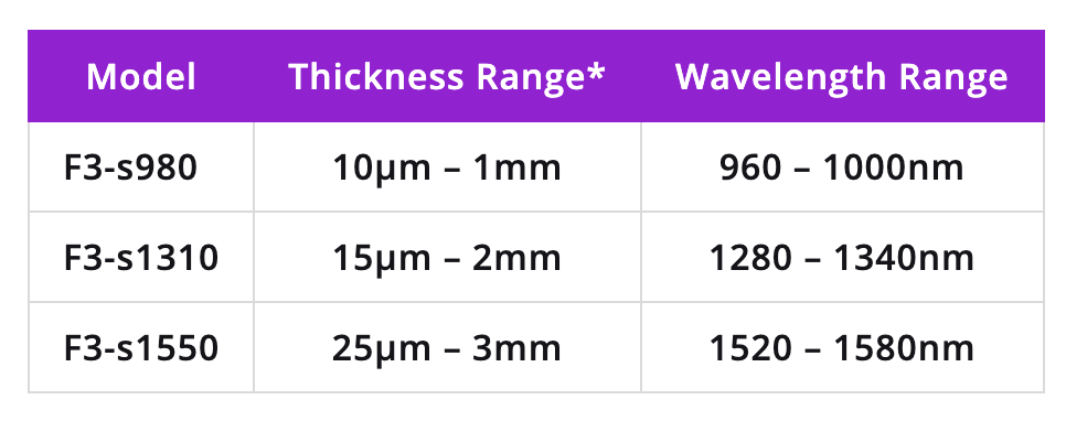 Filmetrics® systems include tabletop, mapping, and production systems for silicon wafer thickness measurement and membrane thickness measurement. Wafer materials commonly measured include single polished or double polished Si (Silicon), Sapphire, Fused Silica, SiC, LiTaO3, GaN, and Glass.