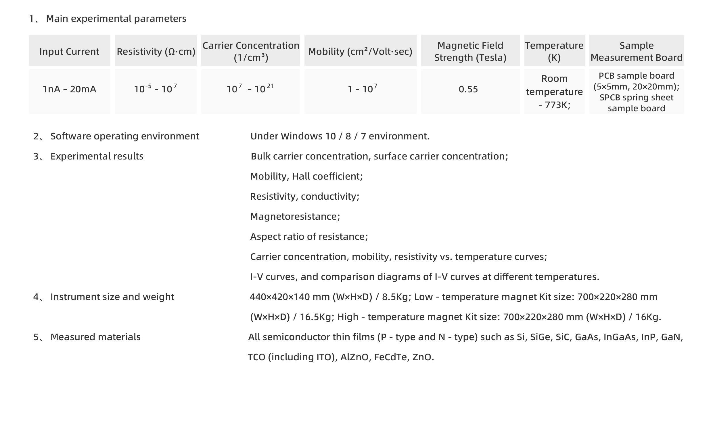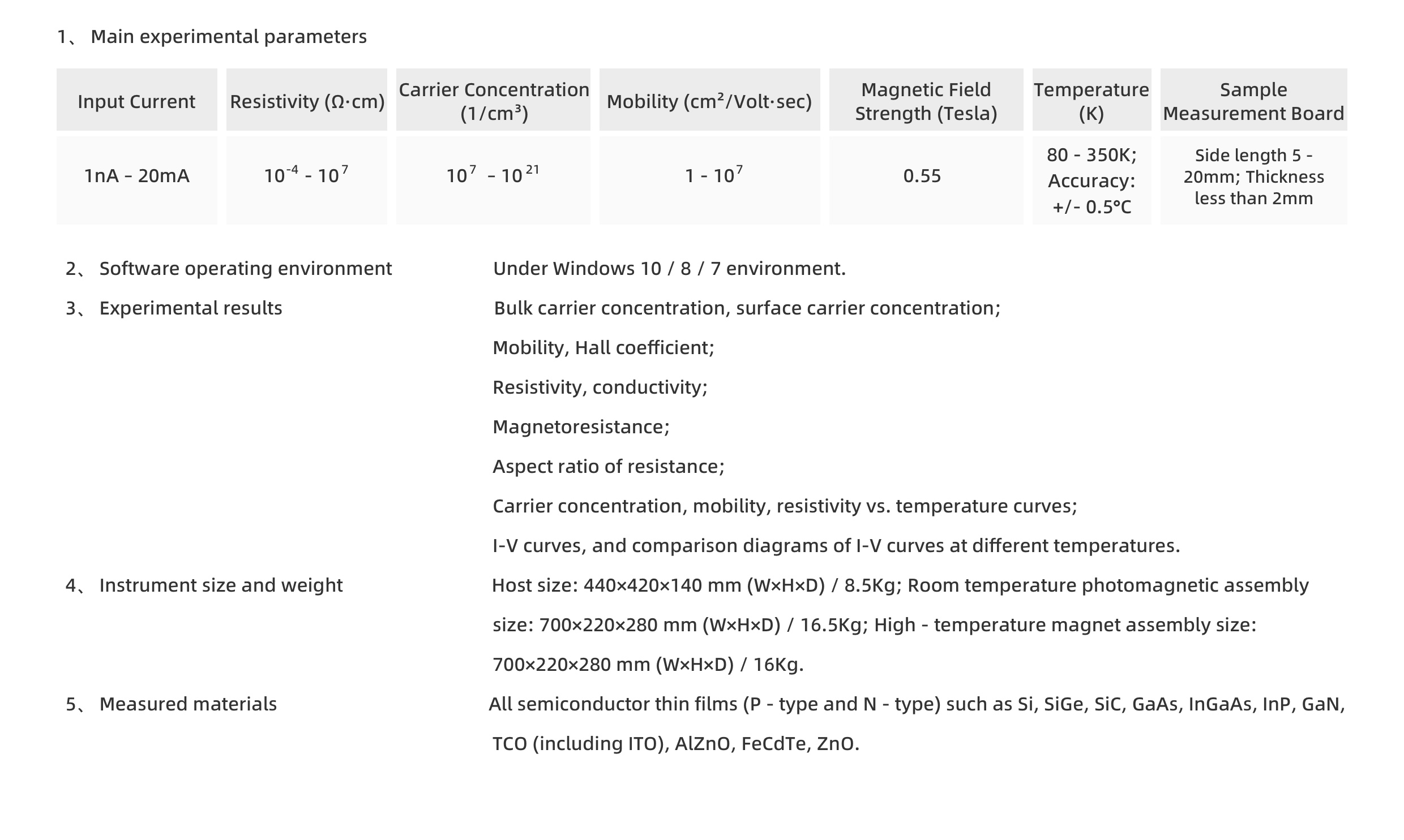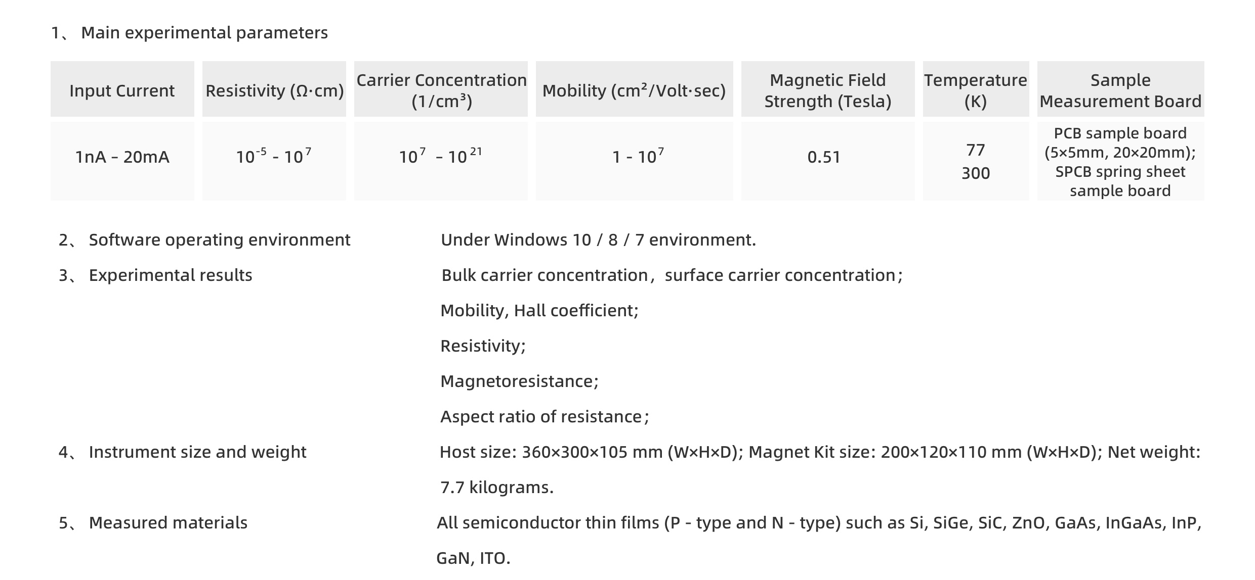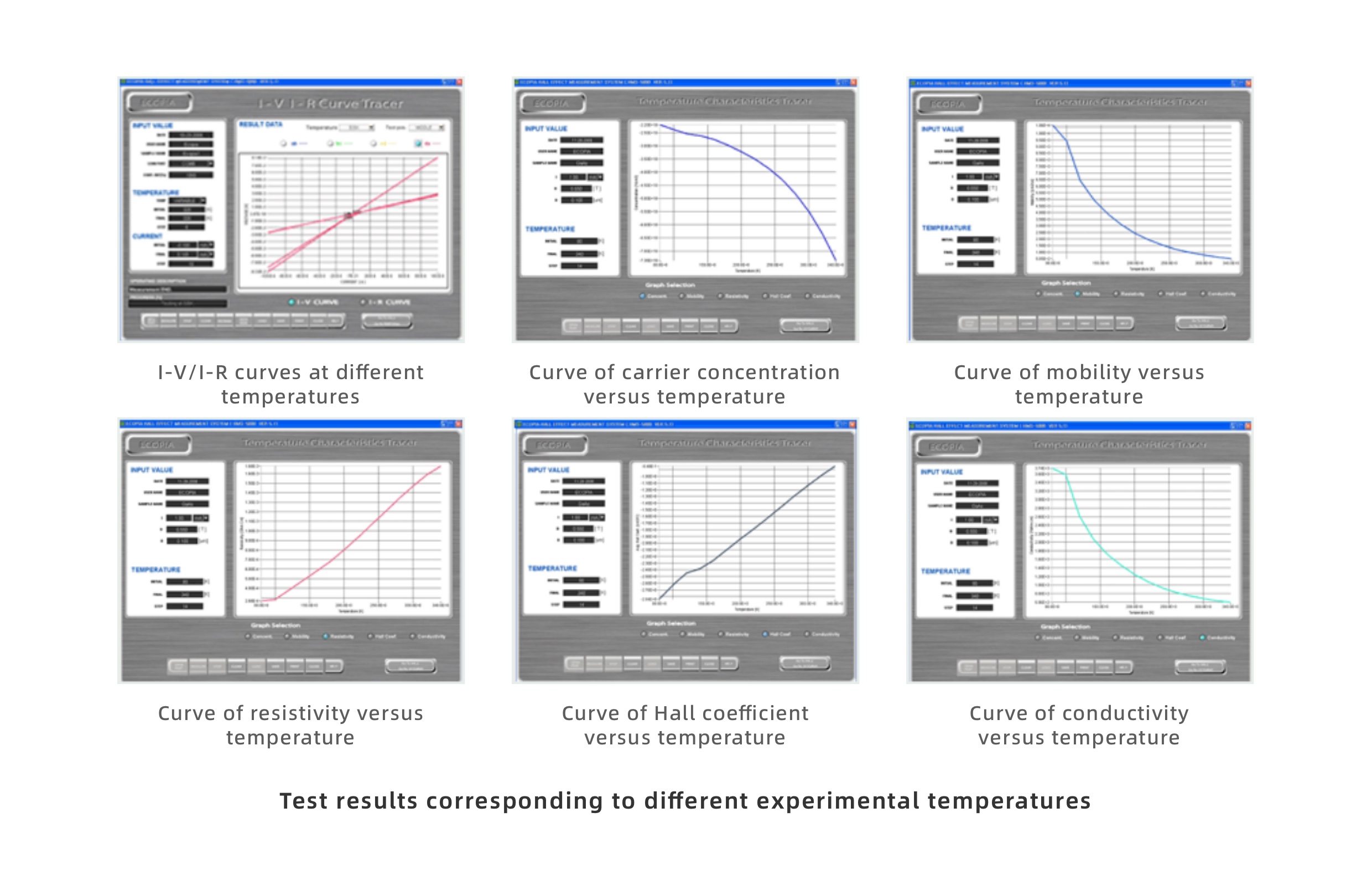 Experimental results are automatically calculated by the software, enabling simultaneous acquisition of parameters including bulk carrier concentration, sheet carrier concentration, mobility, resistivity, Hall coefficient, magnetoresistance, and the vertical/horizontal ratio of resistance.