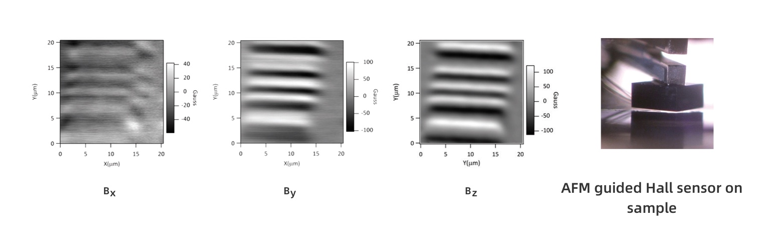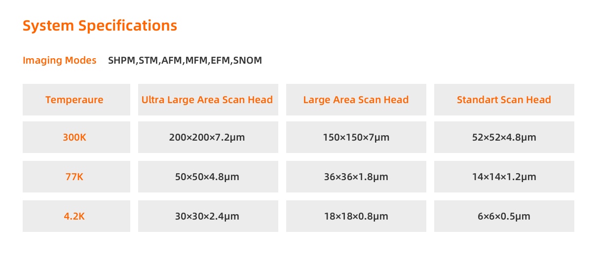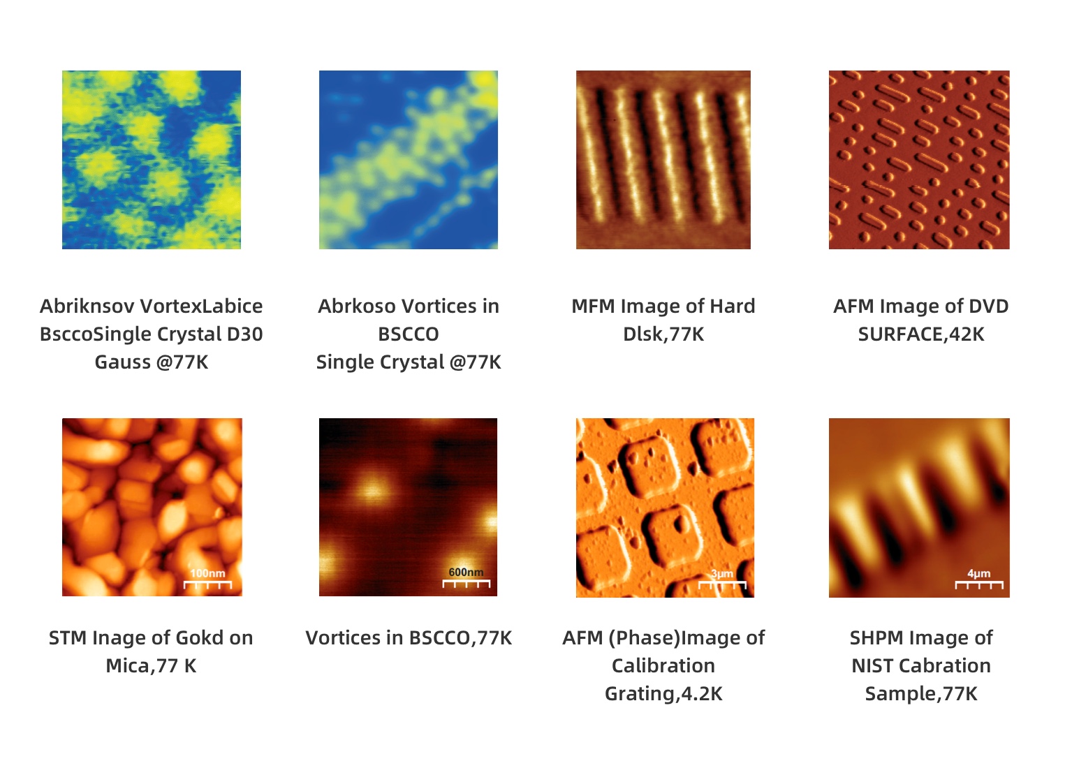 With the help of a micron-sized semiconductor Hall sensor probe, our LT-SHPM enables user to map the surface Hall voltage V H as a function of position, which directly gives the spatial distribution of the local magnetic induction.SHPM systems provides a resolution of ~1 μm imaging with high magnetic field sensitivity. Unlike the magnetic force microscope the SHPM provides direct quantitative information on the magnetic materials without destructing samples. The SHPM can also image magnetic induction under applied fields up to ~16 tesla and over a wide range of temperatures (millikelvins to 300 K). Together with Hall probes, this microscope can be used with STM and QTF probes to conduct Scanning Tunneling Microscopy Imaging and Non-Contact Mode Atomic Force Microscopy Imaging with Quartz Tuning Fork probes.