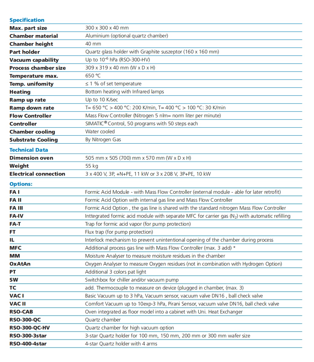The RSO-300 can be used with standard process gases, like Nitrogen, Oxygen and Forming Gas. The chamber is sealed and