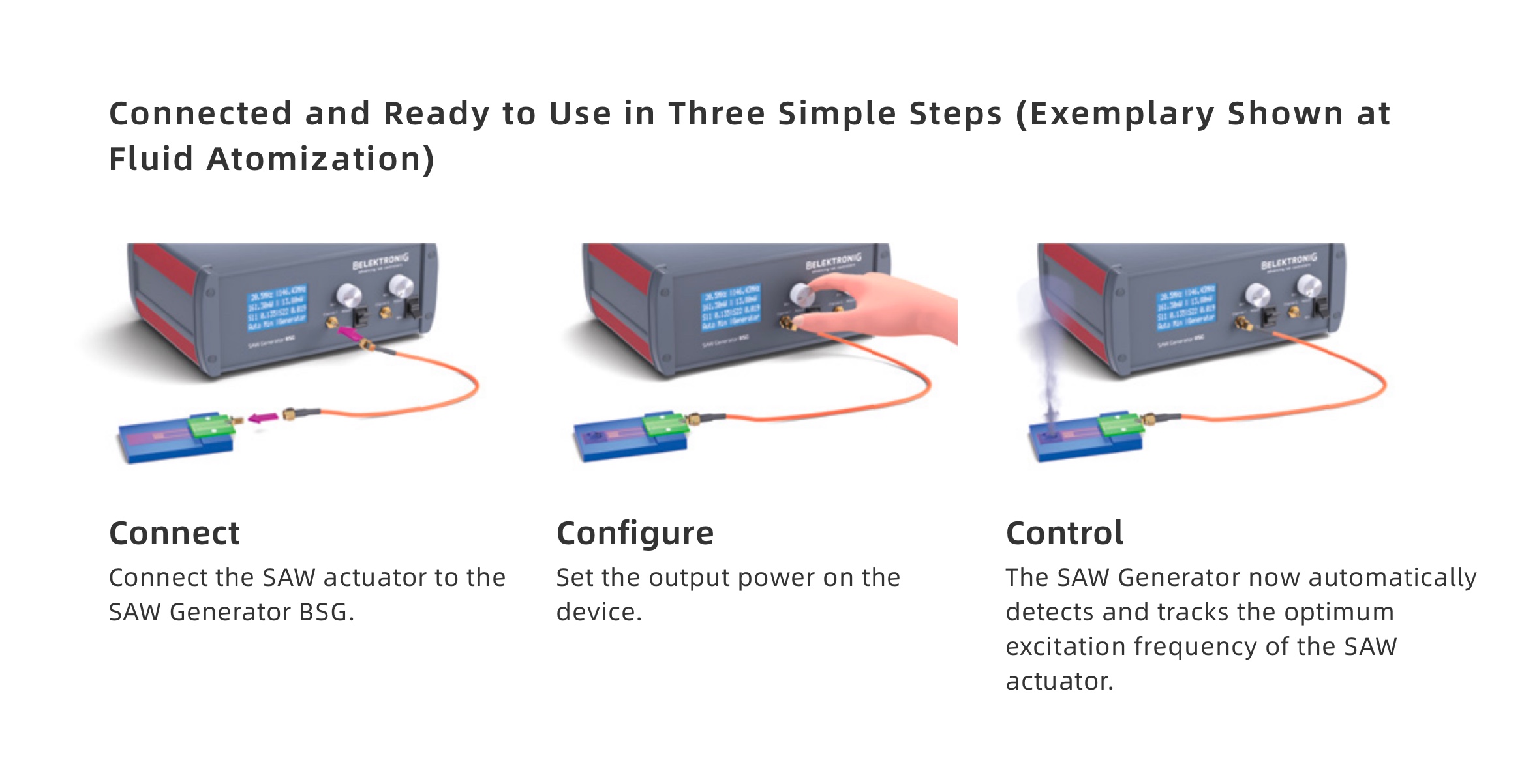 The SAW actuators are driven by a high-frequency alternating voltage with variable frequency and amplitude. The optimal excitation frequency is automatically re-adjusted when deviations are tracked.