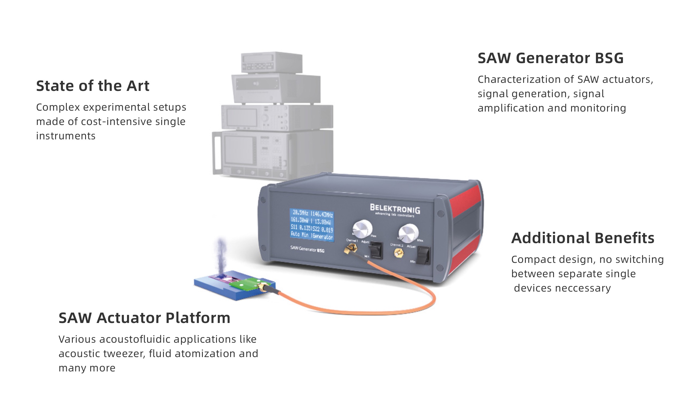 The BELEKTRONIG SAW Generator BSG is used to control SAW actuators for professional applications in acoustofluidics. It integrates network analyzer, frequency generator, power amplifier and power meter in a single compact device. It is capable of replacing the cost-intensive and complex setups that have been necessary so far to drive and characterize SAW actuators.