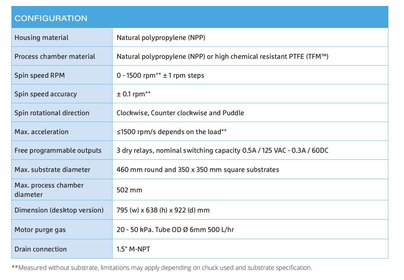 POLOS 450 Advanced Single Substrate Spin Processor, Desktop version with NPP housing, spincup, manual chemical dispense and heavy duty motor. An aerodynamically efficient chamber enhances uniformity, while the natural polypropylene or Stainless Steel process chamber guarantees a contamination-free, easy to clean process area. All units feature programmable CW & CCW Rotation and puddle function.