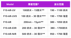 可以使用 Filmetrics F10-AR-UV 测量赋予镜片防水和防油性能的极薄疏水涂层。这种厚度升级使用短波长紫外线来提供准确的测量。