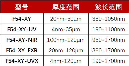 F54-XY系列不同机型的主要区别在于待测薄膜的厚度和光源波段。一般情况下,待测膜厚越小,则需使用更短波长的光源进行测量(如 F54-XY-200-UV),反之长波光源则可以满足更厚、粗糙或透明度更低的薄膜厚度测量需求。